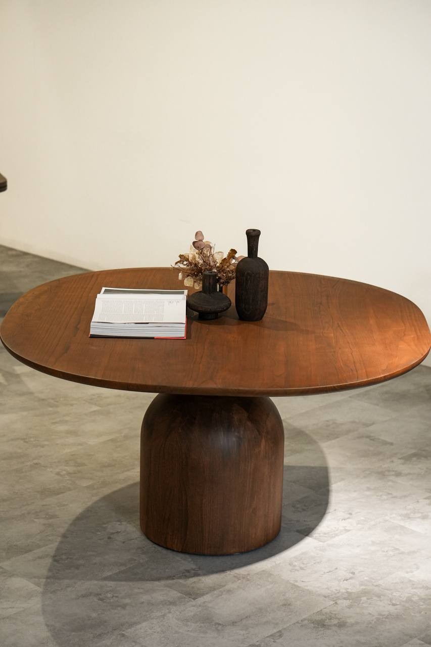 A bold yet refined statement piece, Bello sculptural dining table is crafted from solid wood with a rich walnut finish. Its pedestal base, formed with soft organic curves, brings a sense of quiet strength while keeping the design visually light.