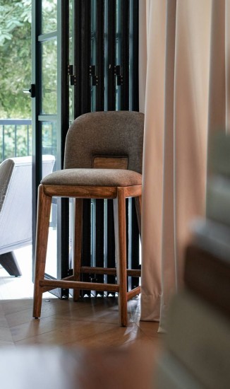A defining feature of the Umi Barstool is its solid wood back panel — a beautifully sculpted detail that anchors the design with warmth and natural texture. This wooden accent adds depth to the form, balancing the softness of the fabric with the authenticity of timber craftsmanship. From every angle, the barstool reveals a harmonious blend of upholstery and joinery, making it visually striking in both kitchen islands and home bars.
