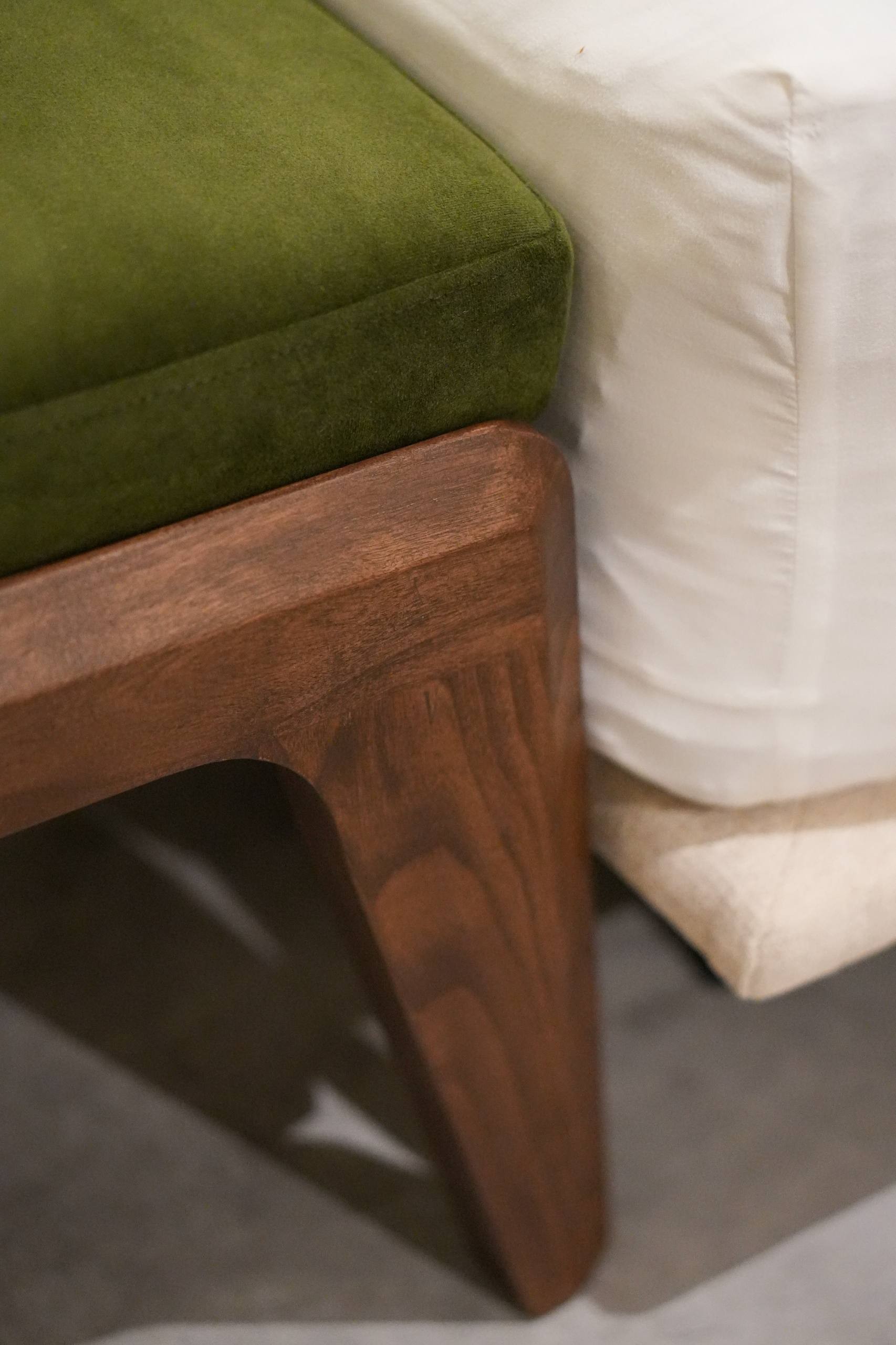The Forest Bench features sculpted legs crafted from solid nyatoh wood, gently flaring toward the floor to create a grounded, organic silhouette. Softly rounded edges and a generous inner arch highlight careful craftsmanship,balanced, intentional, and quietly confident. Finished in a warm, deep tone, the natural wood grain remains visible, allowing the character of solid wood to emerge with time.