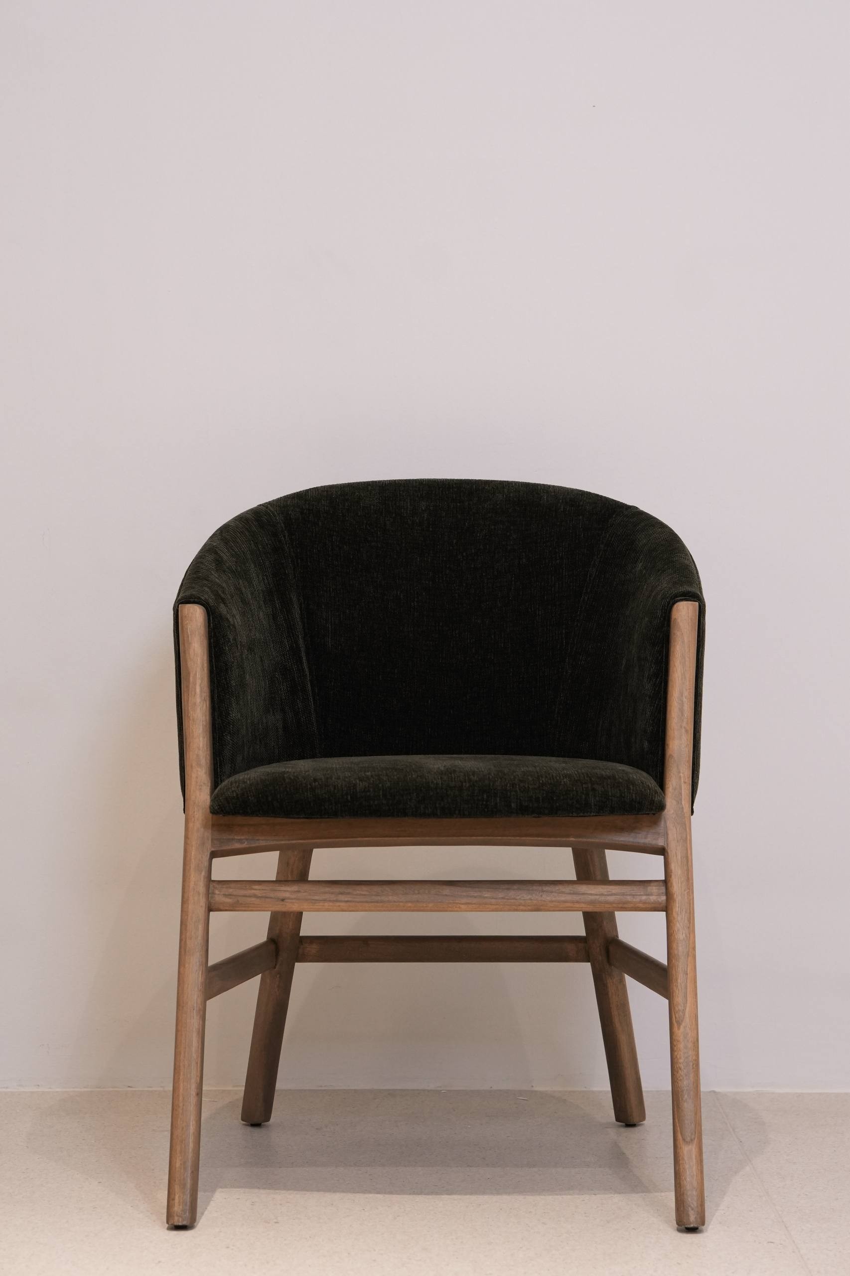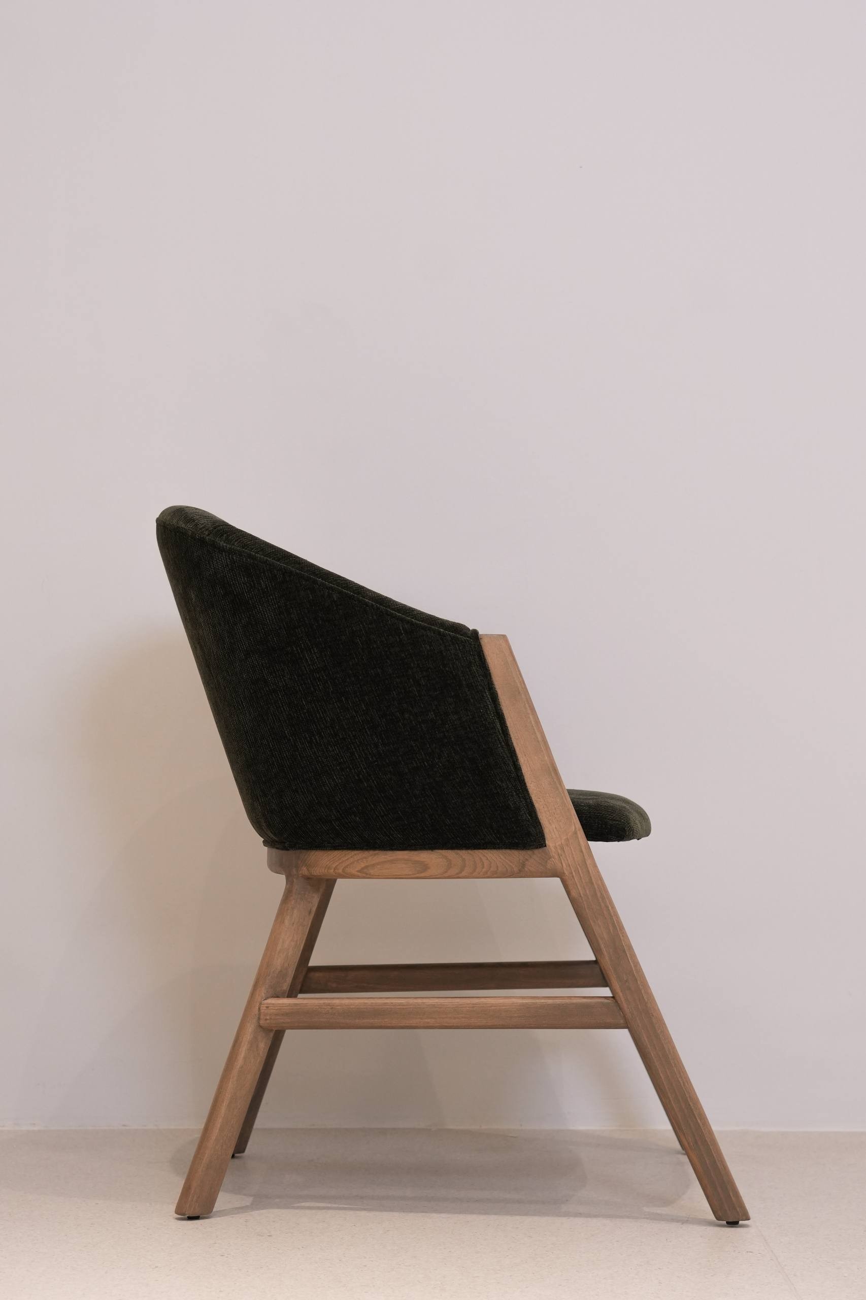 Crafted in solid wood, the frame carries a quiet strength, contrasted by the upholstered seat and back that soften the experience.