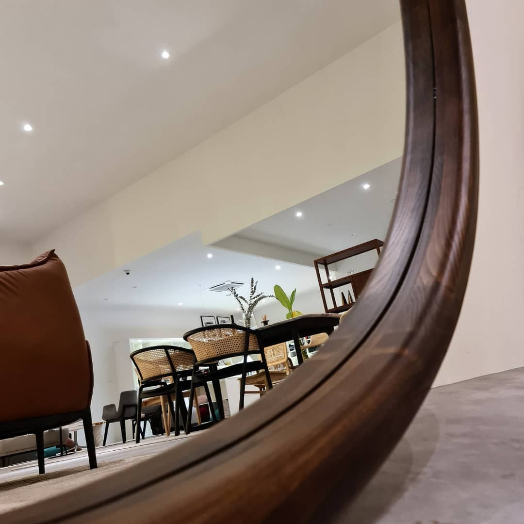 The 2000mm Polly Mirror showcases a classic circular design with a walnut-toned frame, adding quiet elegance and depth to your interior.