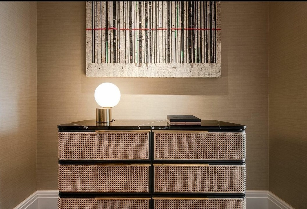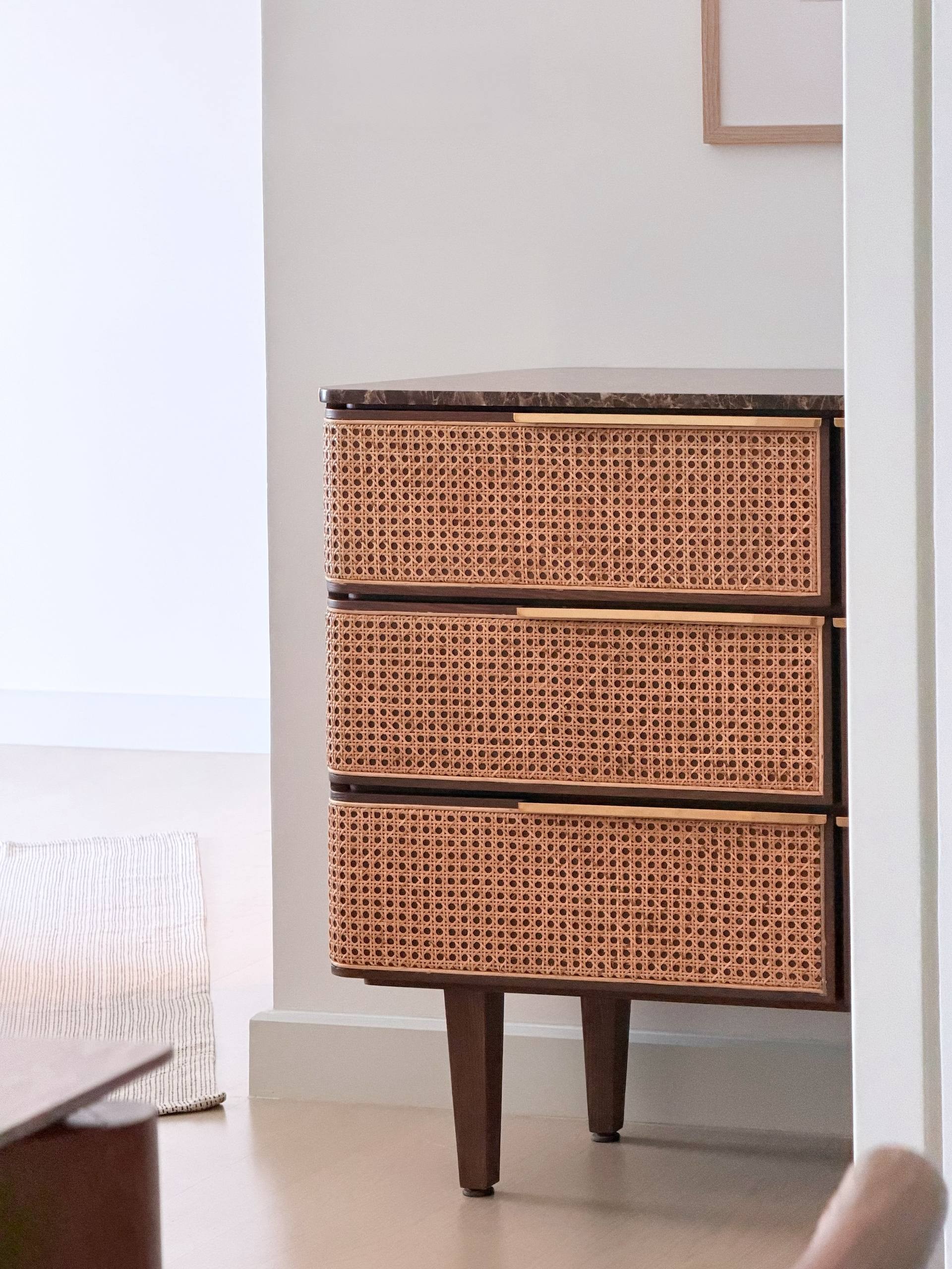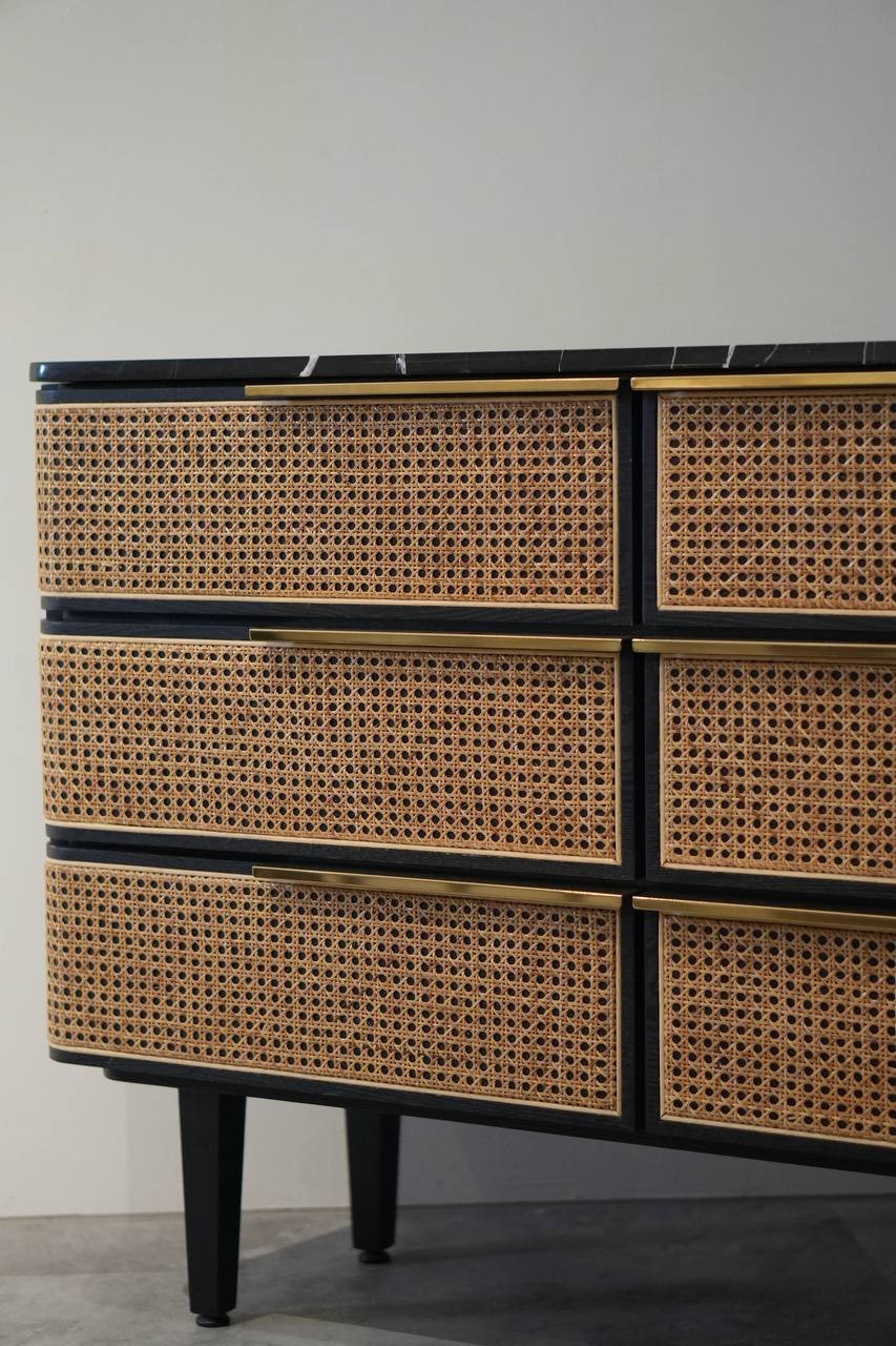 Enhance the overall aesthetic of your space with the 4' NOOI rattan sideboard, the perfect addition to complete your desired look! Crafted with an ash veneer structure, a handwoven rattan cabinet cover, stylish gold handle accents, and an elegant marble top, this exquisite piece of furniture is bound to make a statement. A must-have for Rattan enthusiasts seeking to infuse a blend of boho and modern vibes into their decor!