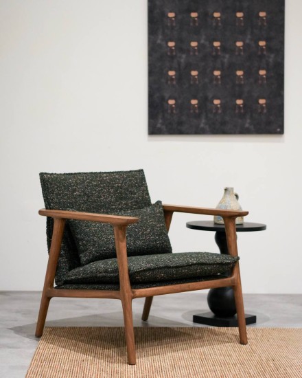 The generously cushioned seat and back are upholstered in a richly textured fabric, offering a relaxed yet supportive seating experience. Subtle curves along the armrests and frame soften the overall silhouette, allowing the chair to sit effortlessly within contemporary, modern, and mid-century inspired interiors.