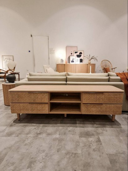 The Mooi designer TV Cabinet is here to save the day and provide you with an elegant, luxurious, yet functional storage solution that is delightful to look at! Its soothing facade is made out of ash veneer structure, natural hand woven rattan door covering, and gorgeous tinted gold trim handles as that subtle opulent detailing. This modern piece is sure to be the focal point and a feature furniture in your living space!
