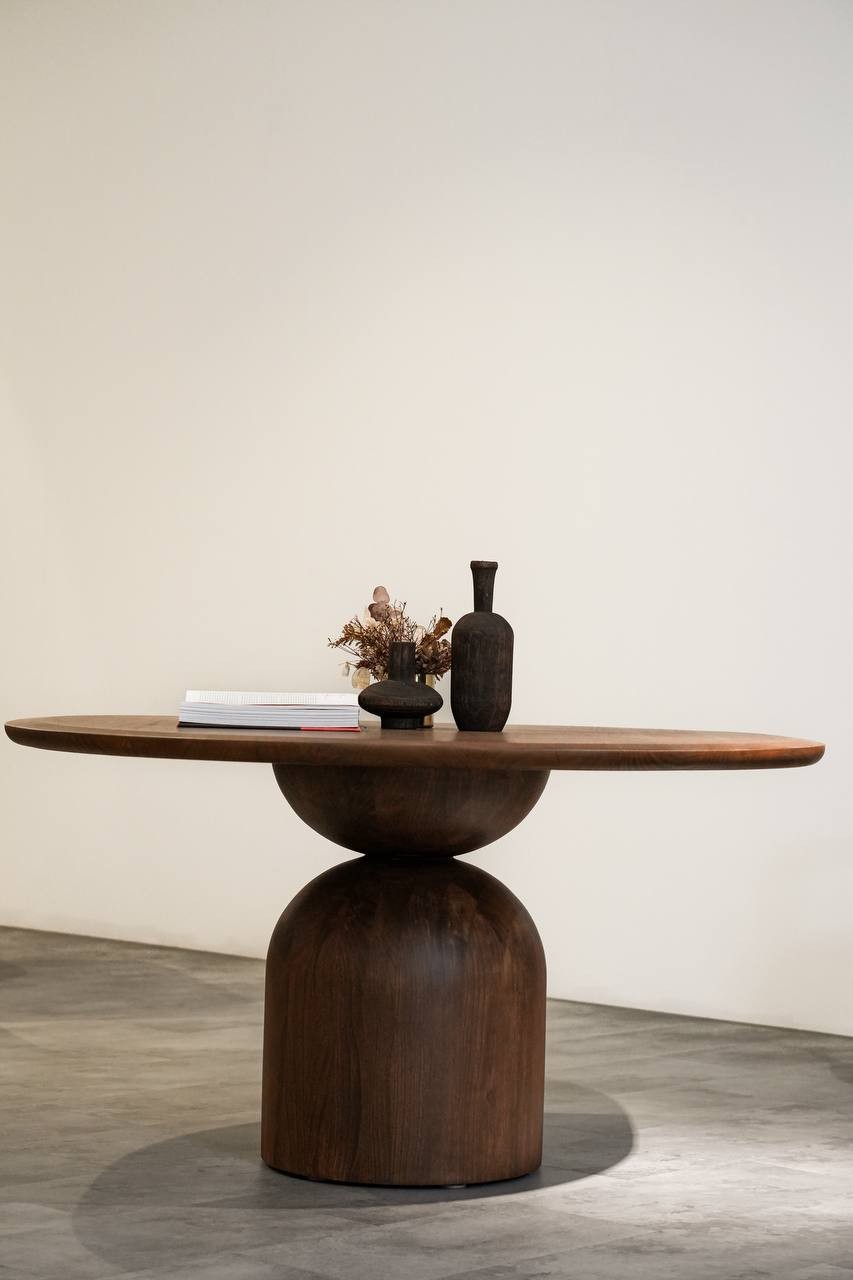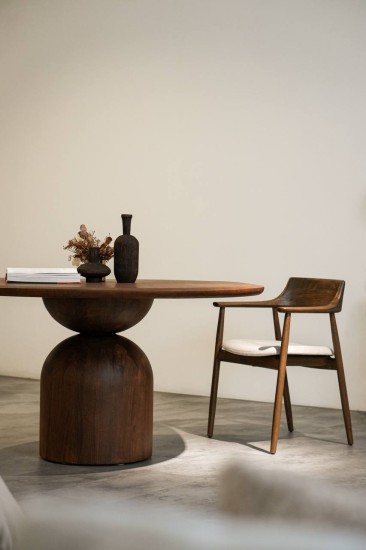 A bold yet refined statement piece, Bello sculptural dining table is crafted from solid wood with a rich walnut finish. Its pedestal base, formed with soft organic curves, brings a sense of quiet strength while keeping the design visually light.