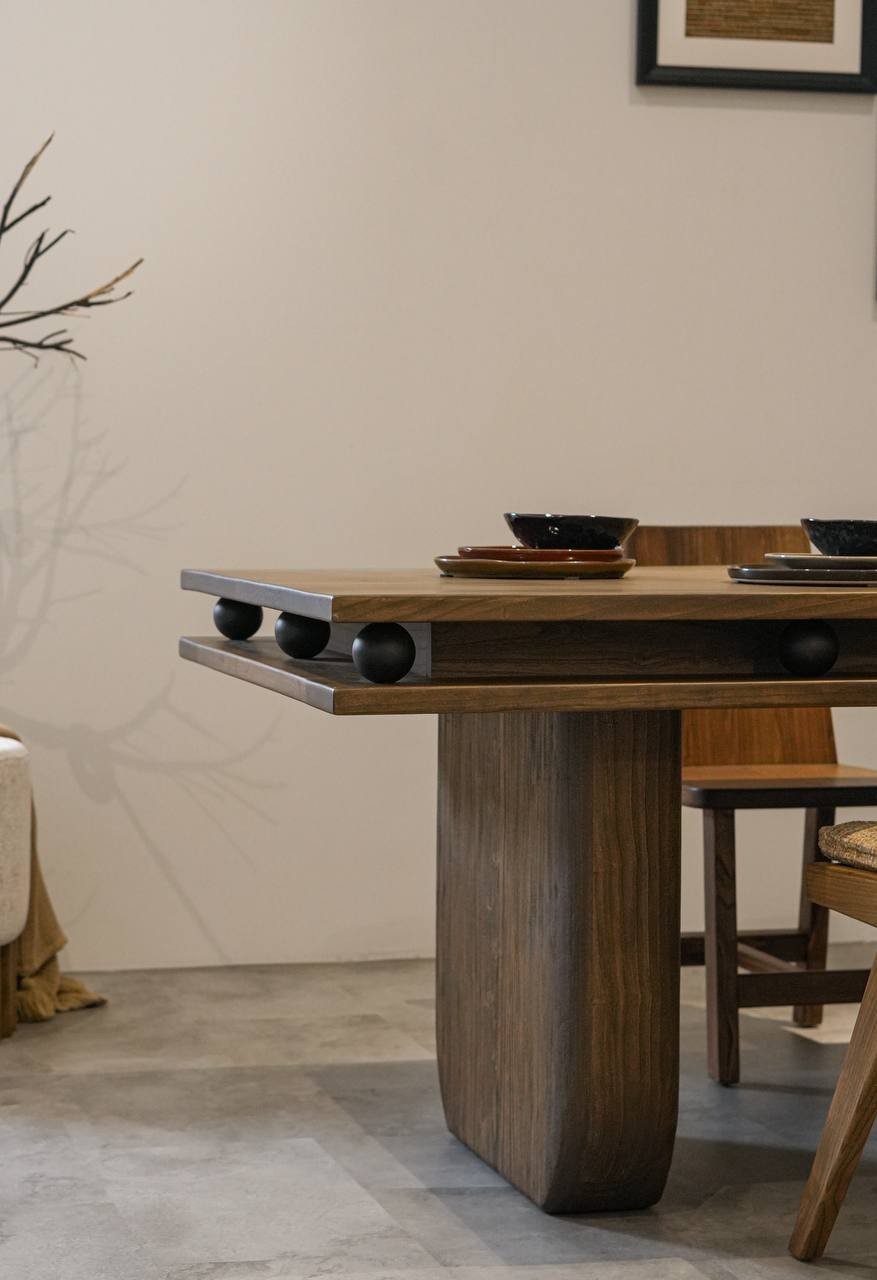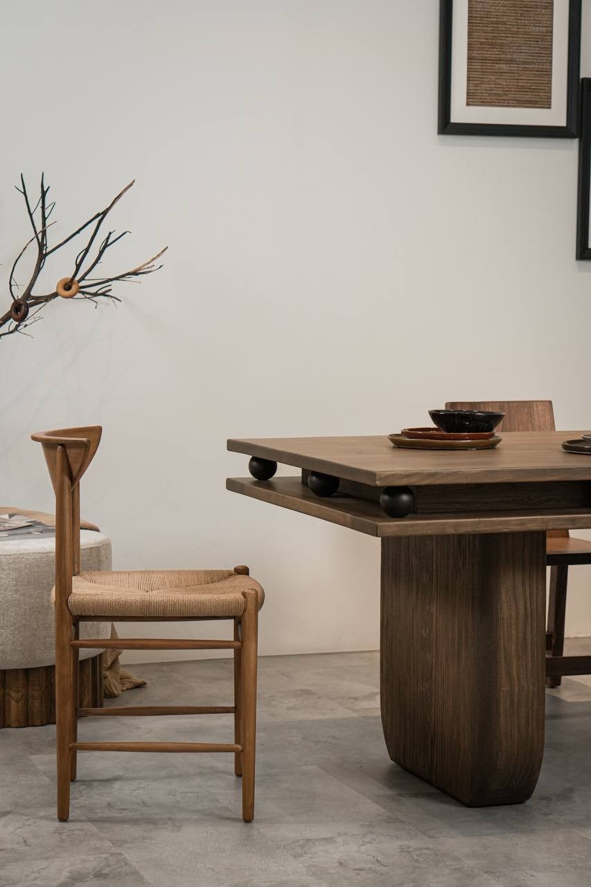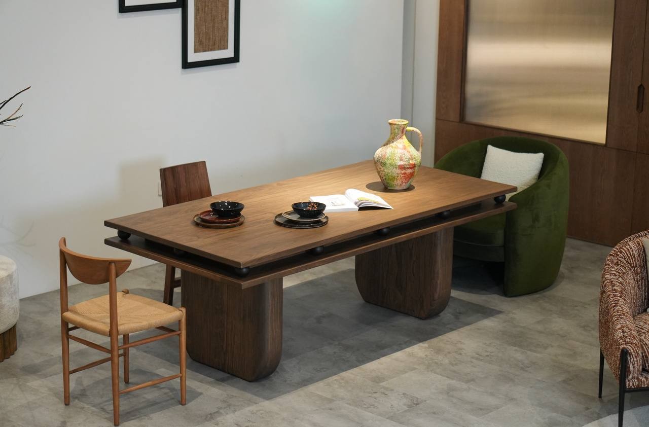 The Ladurée Table is a sculptural dining piece designed for modern organic living. Crafted from solid wood, its bold pedestal legs and rounded detailing create a sense of quiet strength and balance. The smooth rectangular top showcases the warmth of natural wood grains, making it perfect for family meals, intimate dinners, or stylish gatherings.