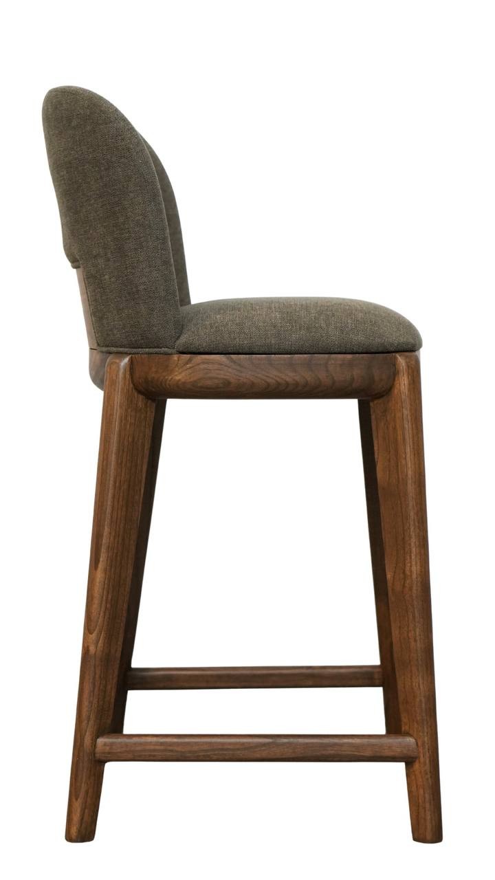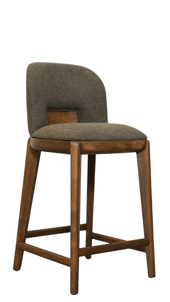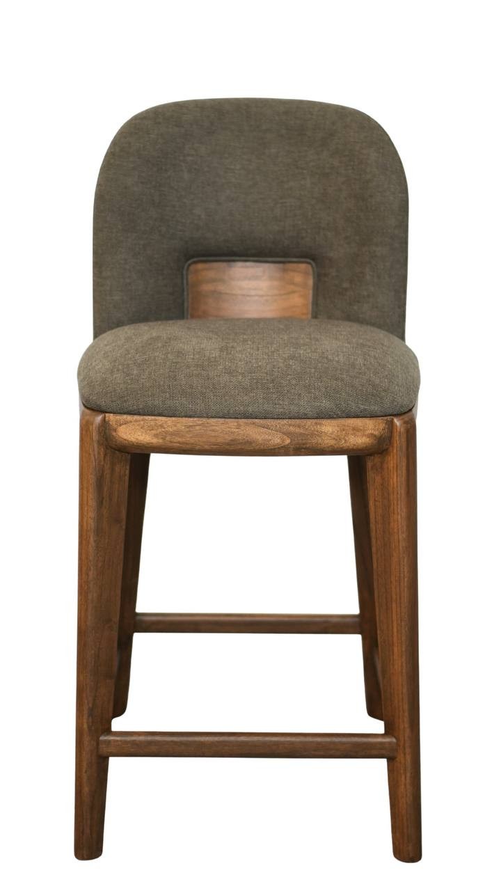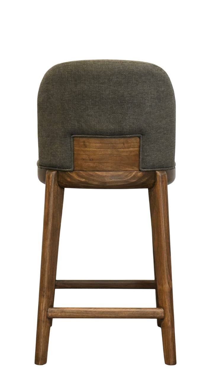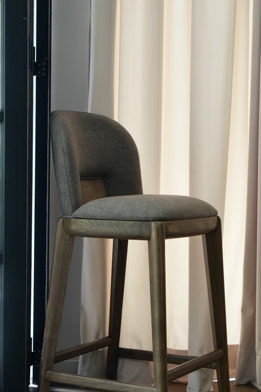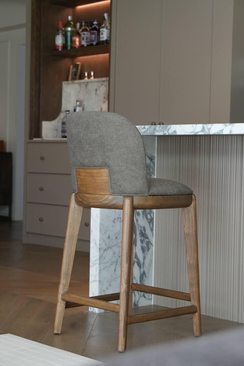 A defining feature of the Umi Barstool is its solid wood back panel — a beautifully sculpted detail that anchors the design with warmth and natural texture. This wooden accent adds depth to the form, balancing the softness of the fabric with the authenticity of timber craftsmanship. From every angle, the barstool reveals a harmonious blend of upholstery and joinery, making it visually striking in both kitchen islands and home bars.