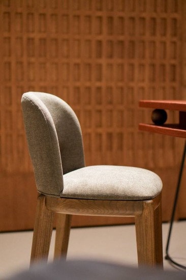 A defining feature of the Umi Barstool is its solid wood back panel — a beautifully sculpted detail that anchors the design with warmth and natural texture. This wooden accent adds depth to the form, balancing the softness of the fabric with the authenticity of timber craftsmanship. From every angle, the barstool reveals a harmonious blend of upholstery and joinery, making it visually striking in both kitchen islands and home bars.