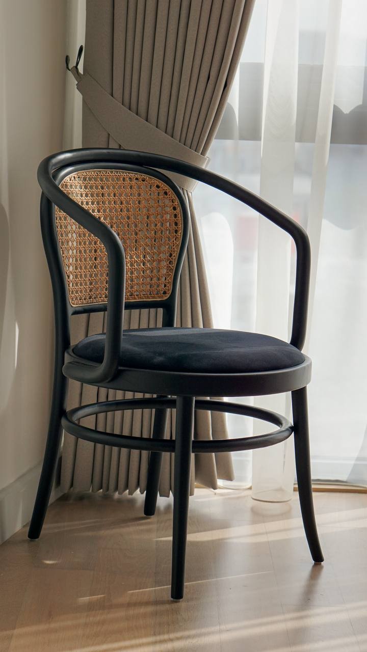 The hand-woven rattan backrest adds a layer of texture and lightness, creating subtle contrast against the depth of the timber frame. It allows air and light to move freely through the chair, giving it an openness that feels relaxed yet considered. A generously padded seat completes the experience, offering comfort that invites lingering without overwhelming the design.